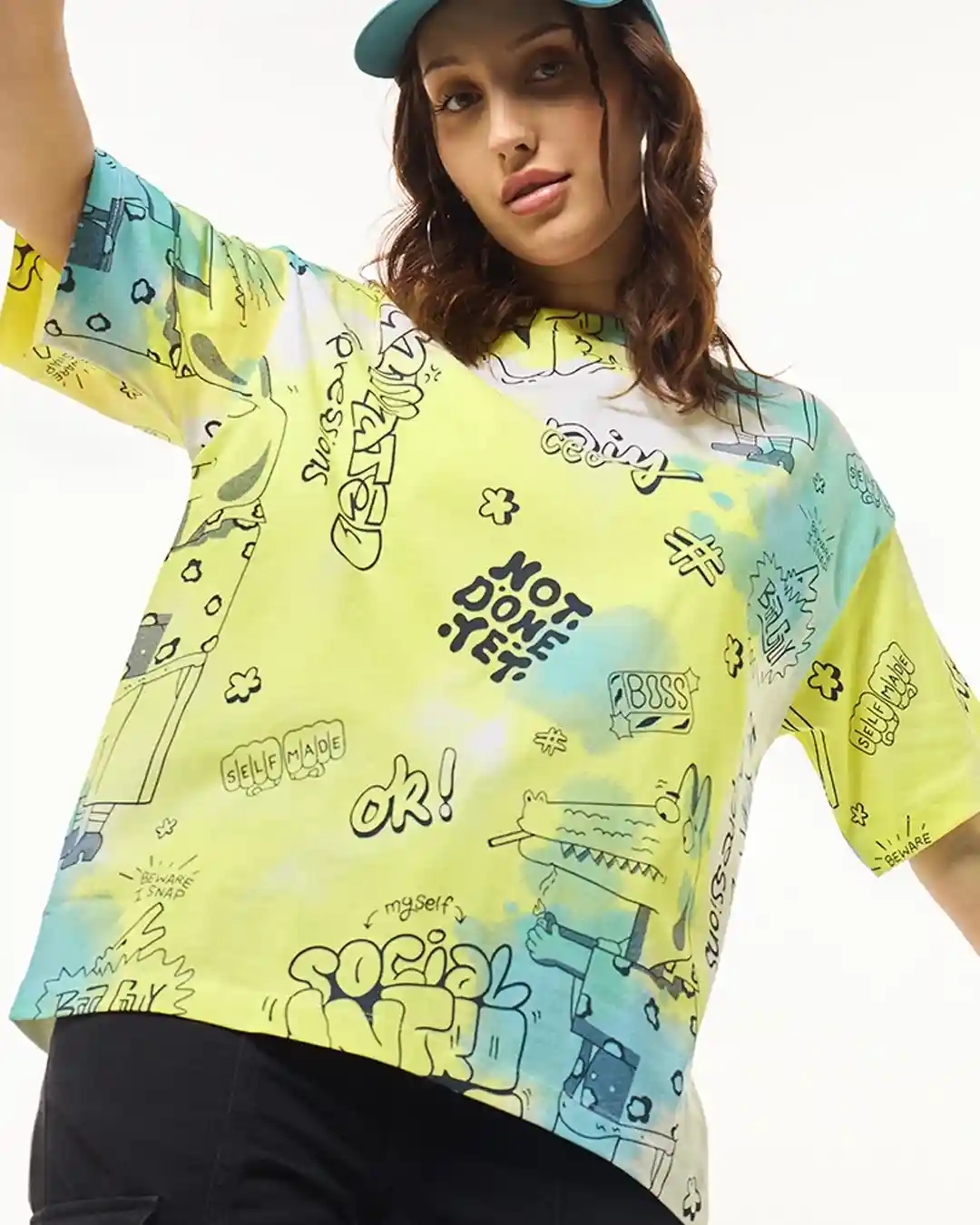 Let your outfit do the talking with this vibrant yellow oversized t-shirt, splashed with quirky doodles, viral phrases, and Gen-Z humor. From “Not Done Yet” to “Self Made”, every detail of this tee screams personality. It’s not just a fashion piece — it’s a full-blown mood board in wearable form.