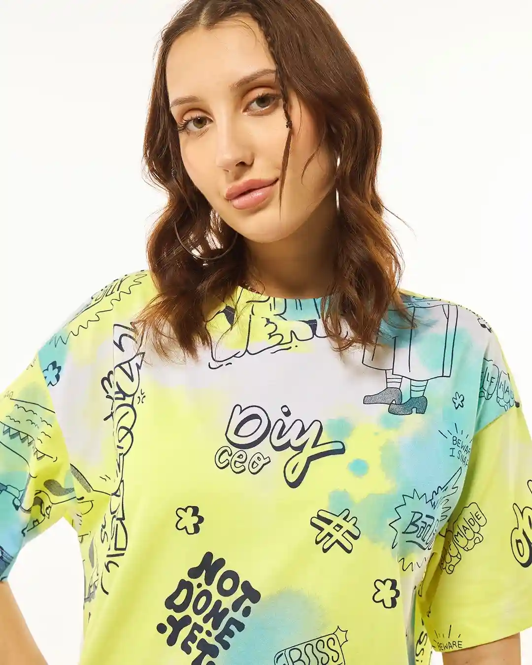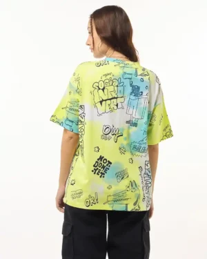 The cool graffiti-inspired print in shades of blue, black, and pastel gives major streetwear energy, making this tee perfect for bold trendsetters. Whether you’re hitting the city streets, chilling with your crew, or making Reels, this top ensures you stand out loud and proud.