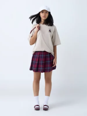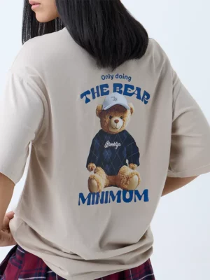 The highlight of the design is the small, quirky teddy bear graphic placed on the left chest area, accompanied by the playful slogan “The Real Minimum”. The minimal yet charming placement of the print adds just the right amount of character without overwhelming the clean, neutral beige tone of the shirt. This makes it versatile enough to pair with various bottoms — from classic jeans and shorts to skirts and joggers.