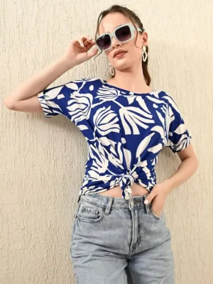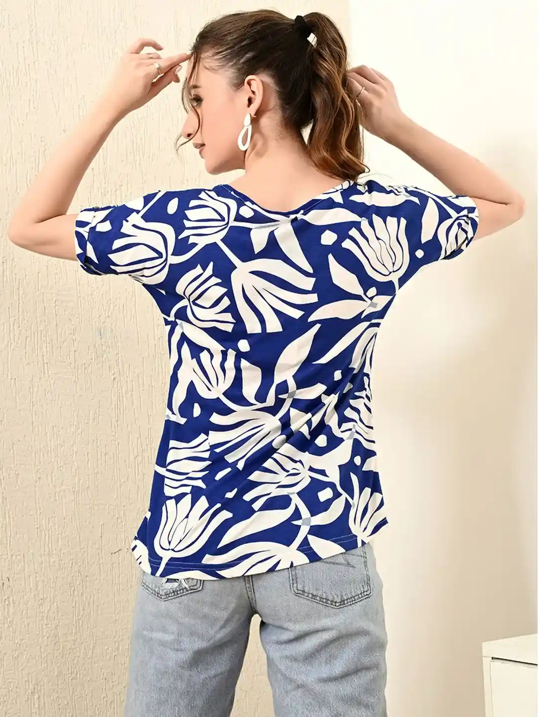 This blue and white oversized print T-shirt combines comfort with the confidence of a power move. Designed for women who thrive in both business meetings and brunch outings, this top is a smart investment for your fashion portfolio.
