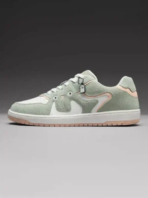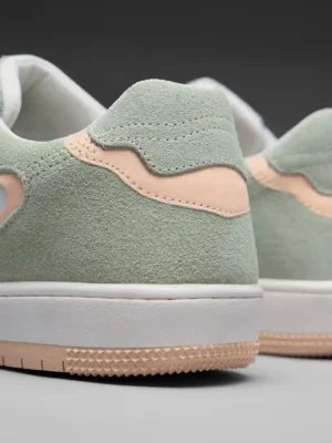 The upper features a combination of soft green suede overlays and crisp white perforated leather panels. The suede wraps around the toe, sides, and heel in a flowing pattern, adding texture and visual interest. Light peach accents outline the suede sections, creating a warm contrast that enhances the overall look without overpowering it.