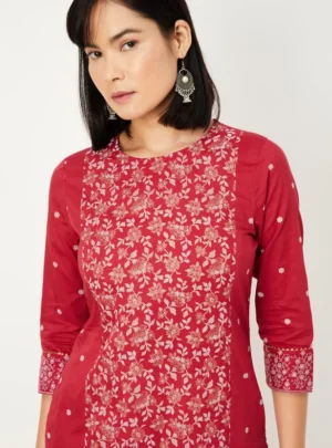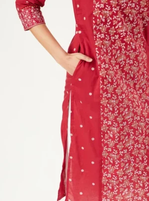 Rendered in a deep, rich crimson hue, the kurta is adorned with an enchanting floral print panel running vertically through the front. This design element not only adds visual interest but also creates a lengthening effect, making it flattering on all body types. The floral motif is delicate yet impactful, exuding a sense of quiet sophistication.