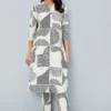 The side panels, sleeves, and back are sprinkled with small, subtle butti prints that harmonize beautifully with the central floral design. Three-quarter sleeves provide a balance of style and practicality, while the cuffs feature contrasting printed detailing for an extra touch of artistry. The round neckline maintains a classic appeal, making it easy to accessorize with earrings, scarves, or even a statement necklace.