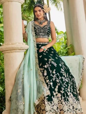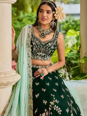 Indulge in the essence of regal fashion with our Emerald Green Organza Embroidered Lehenga Choli with Sky Blue Dupatta, a masterpiece that blends the opulence of traditional Indian craftsmanship with US-inspired high-fashion trends. Designed for modern brides and elite wedding guests, this ensemble delivers a powerful statement of luxury and elegance.