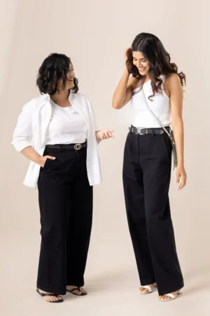 The regular fit cut offers all-day comfort, while the tailored lines enhance your leg profile, creating a flattering yet professional silhouette. With functional side pockets for essentials, a secure waistband, and a streamlined design, these trousers balance practical utility with luxury aesthetics.