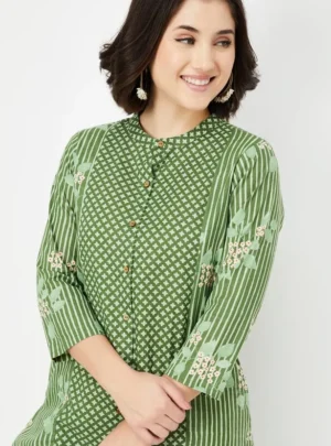 The Green Printed Straight Kurta is a refreshing take on everyday ethnic wear, effortlessly combining modern design with traditional sensibilities. Its unique pattern play sets it apart — the central panel showcases an all-over geometric print, while the side panels introduce vertical stripes adorned with delicate floral motifs. This clever mix not only adds visual intrigue but also creates an elongating effect for a flattering silhouette.