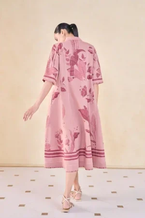 Set against a warm peach-toned backdrop, the dress’s cool hues pop with clarity, highlighting its intricate design and flattering shape. This ensemble is a celebration of western casualwear with a refined, global twist—perfect for women who value style that speaks softly but confidently.