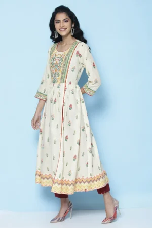 The soft ivory base serves as a graceful canvas for delicate multicolored floral prints, creating a refreshing and sophisticated look. At the heart of this piece lies a beautifully embroidered yoke with intricate floral motifs framed by green and orange borders, inspired by traditional Indian artistry yet perfectly in sync with global fashion trends seen in premium US markets.