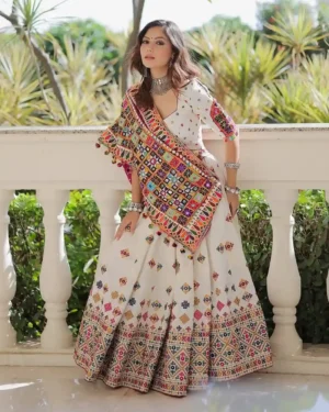 Whether you’re attending a high-profile wedding, Navratri celebration, or destination event, this chaniya choli ensures you exude the confidence of a market leader and the grace of cultural royalty. Pair it with oxidized silver jewelry or antique gold pieces for a complete heritage-luxe statement.