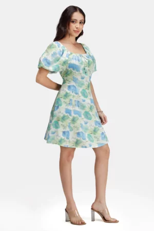 Dress for joy—and watch the compliments roll in. The Liquid Bloom Puff-Sleeve Fit & Flare Mini Dress channels fresh US trend energy with a watercolor floral that looks hand-painted in cool seafoam, mint, and sky-blue tones. The square neckline with a dainty tie flatters the collarbone, while softly structured puff sleeves balance the silhouette and add a touch of romance. Shaped through the bodice and released into a breezy A-line skirt, it’s that rare throw-on piece that feels dreamy yet tailored, playful yet polished.