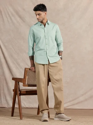 The soft mint green hue evokes a calm, clean aesthetic, making it a perfect pick for spring and summer seasons. Its solid design provides maximum styling flexibility — pair it with neutrals for a subtle tone-on-tone look or contrast it with darker trousers for a crisp, polished edge. The shirt is tailored in a regular fit with full sleeves and a spread collar for timeless structure.
