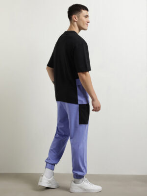The oversized T-shirt features a lavender and grey color-block design, a classic round neck, and regular sleeves, giving it a striking visual contrast while maintaining casual wearability. The matching utility cargo joggers are built for function and style, featuring multiple flap pockets for storage, a mid-rise fit, and elasticated cuffs for a tapered, athletic look.