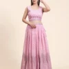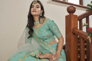 This Pastel Aqua Blue Lehenga Choli is a refreshing and elegant ensemble that perfectly blends softness with festive charm, making it ideal for weddings, engagements, and day-time celebrations.