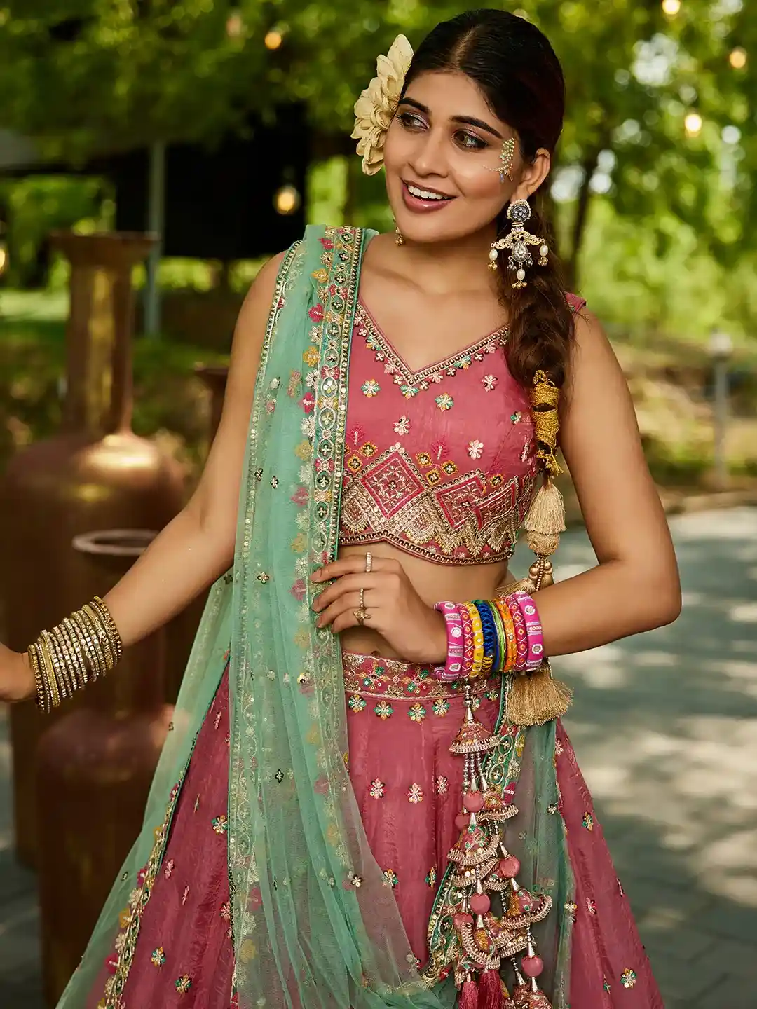 • Color: Vibrant Pink Lehenga & Choli with Contrasting Mint Green Dupatta