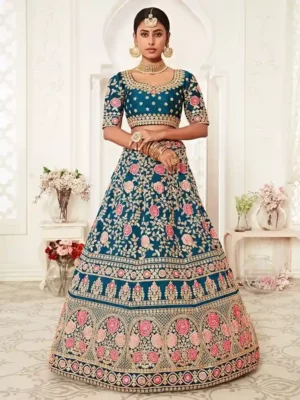 This Regal Blue Bridal Lehenga Choli is an epitome of grandeur and sophistication, designed for the bride who desires to make a bold yet traditional statement. The rich royal blue base in luxurious fabric sets a majestic tone, while the exquisite embroidery work infuses it with timeless bridal charm.