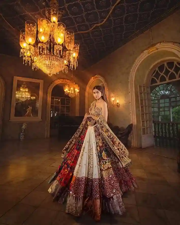 The blouse follows an equally sophisticated vision, featuring an off-shoulder neckline adorned with detailed hand embroidery. Its design subtly mirrors the patchwork lehenga, tying the entire look into one cohesive, statement-making silhouette. Paired with a lavishly embellished dupatta draped in an elegant pallu style, the outfit exudes an unmistakable royal aura.