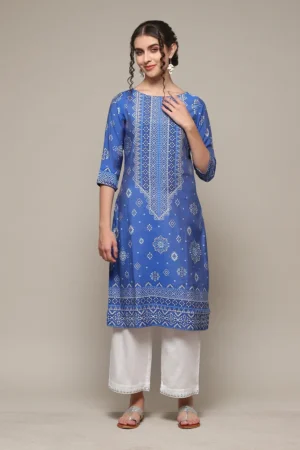 The neckline features a detailed geometric pattern that draws inspiration from traditional embroidery yet is digitally crafted for precision and durability. The three-quarter sleeves add a practical touch, keeping the style versatile for both formal and casual settings. This kurta is tailored to deliver a flattering yet modest look, making it suitable for all body types.