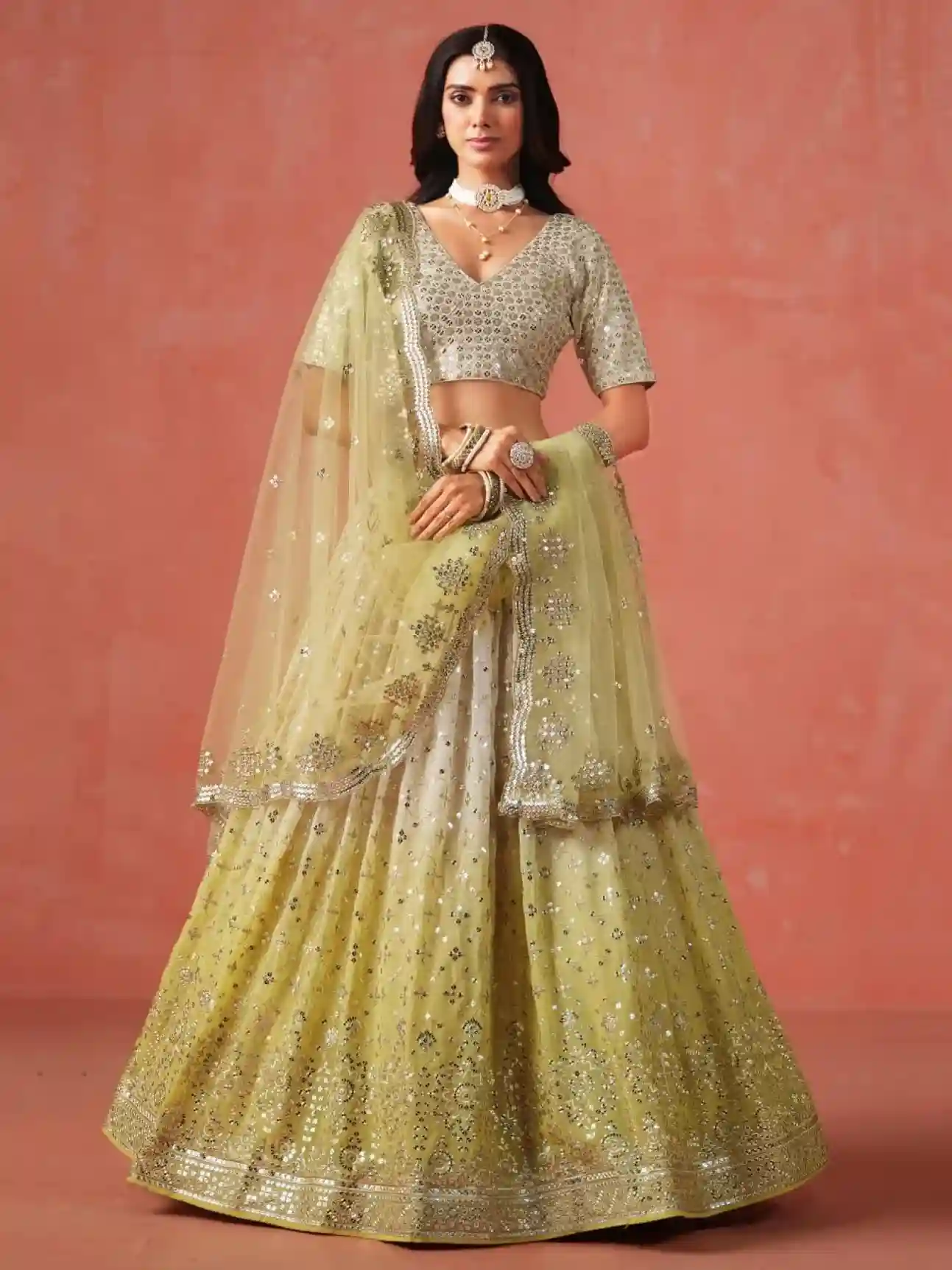 The lehenga flows in a graceful ombre transition from soft beige to warm yellow, adorned with all-over mirror work and shimmering sequin embroidery. The hemline features a detailed floral and geometric border that adds grandeur without overpowering its romantic appeal.
