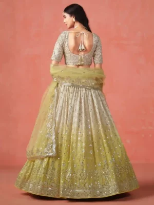 Step into ethereal elegance with our Soft Yellow-Beige Ombre Georgette Lehenga Choli, a dreamy blend of delicate colors and intricate craftsmanship. Designed for modern brides and wedding guests in the USA, this ensemble brings together subtle luxury and sparkling charm.