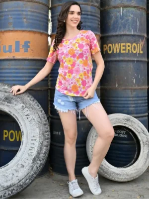 Turn up your confidence like summer heat in this multi-floral printed tee – a must-have for anyone who loves to stand out with effortless charm.