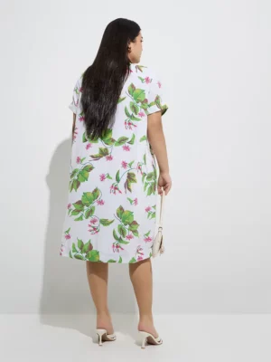 Crafted in a pristine off-white base, the dress is brought to life with vibrant tropical floral prints in lush green and bold pink tones, echoing the serene yet exotic energy of island escapes. The relaxed shirt-dress silhouette, coupled with a V-neckline and short sleeves, ensures all-day comfort while flattering your natural curves—making it a staple for bank brunch meetings by the beach, coastal trade shows, or evening resort dinners.