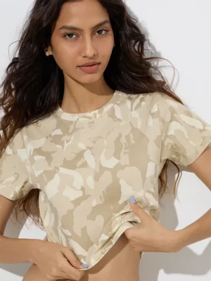 Bring a bold yet laid-back vibe to your casual wardrobe with the Beige Camouflage Crop T-Shirt — the perfect fusion of streetwear style and everyday comfort. This t-shirt is designed for women who love effortless fashion with a statement twist.