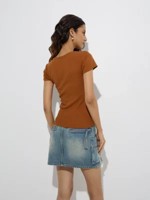 Crafted from a soft, stretch-infused ribbed fabric, this t-shirt hugs the body gently without feeling restrictive. The rib-knit texture not only enhances its visual appeal but also provides flexibility and shape retention, ensuring it looks just as good after multiple wears. Its breathable material keeps you comfortable in warm weather, while the fitted silhouette makes it a perfect layering piece under jackets, cardigans, or overalls.