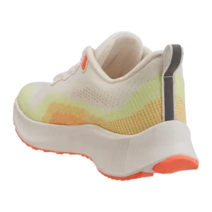 The upper features a lightweight cream mesh that allows airflow and flexibility. A striking orange-to-yellow gradient wraps from the midfoot to the heel, adding energy and visual flair. Flat white laces thread through orange eyelets, while the padded tongue and collar ensure a snug, supportive fit. A heel pull tab makes them easy to slip on and off.
