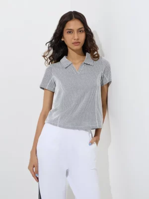 The Women’s Navy & White Micro-Striped Polo Collar T-Shirt is a refined yet relaxed wardrobe essential that perfectly blends timeless style with modern ease. Designed for women who appreciate subtle elegance in casual wear, this t-shirt delivers both comfort and effortless versatility.